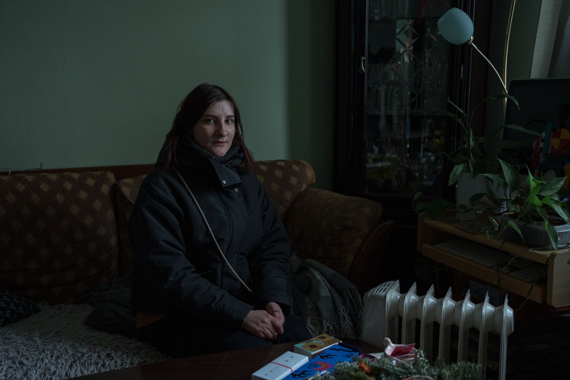 Olena works from home in three layers of clothes. On the fourth day without heat, she gave up trying to keep the whole place warm and shut all the doors. Now she lives in the living room. It’s her bedroom, her kitchen, and her office. It’s a workday, and Olena is put-together — wearing a rosy, cozy sweater, her hair carefully done.