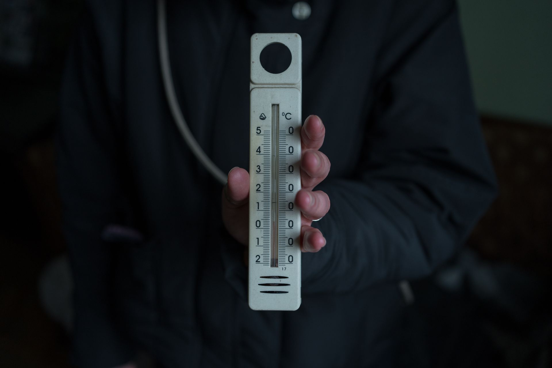 A room thermometer is seen in Anna Diachenko’s apartment in Kyiv, Ukraine, on Jan. 13, 2026. (Elena Kalinichenko / The Kyiv Independent)