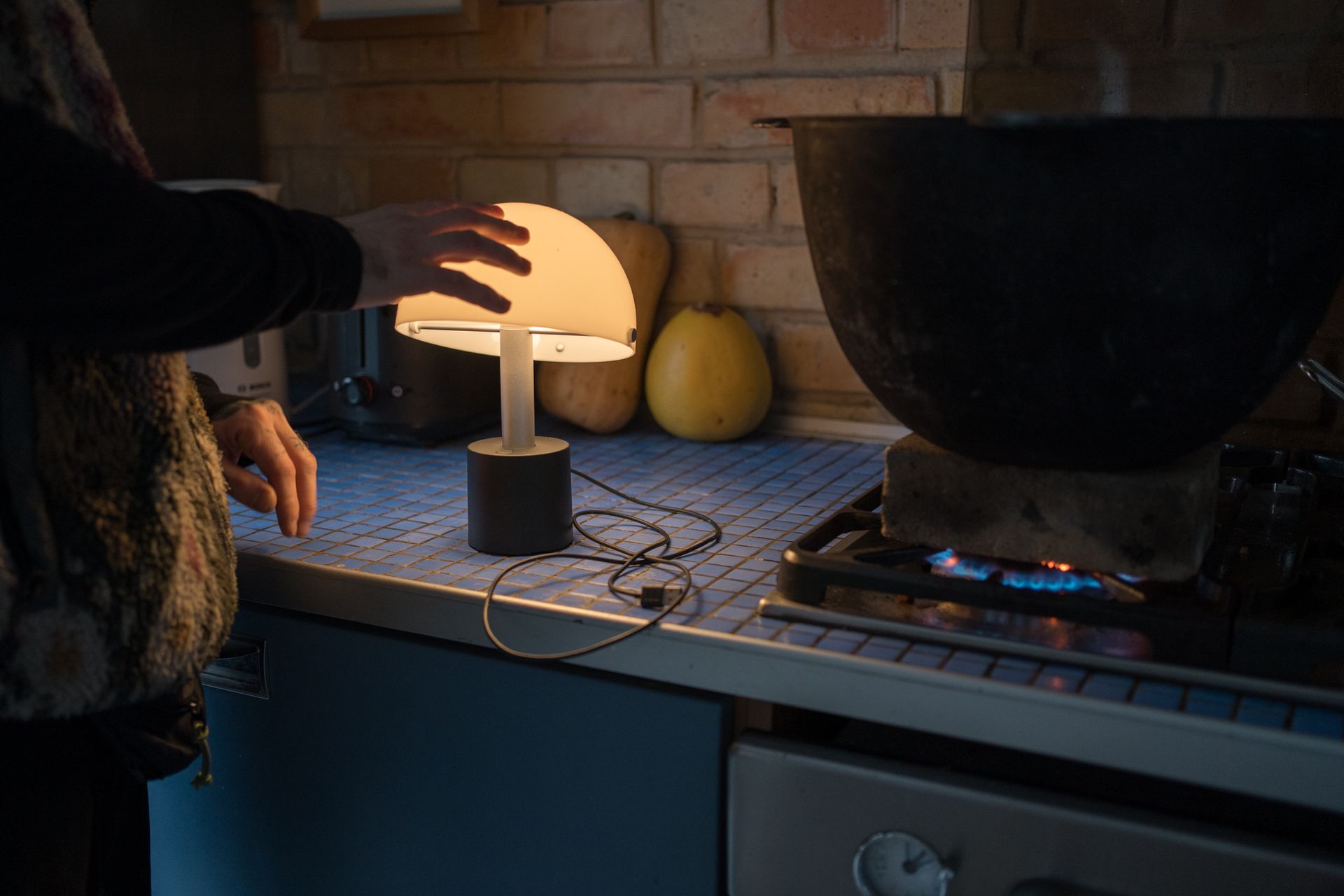 Andrii Tartyshnikov turns on a portable light next to a brick and cast-iron boiler placed on a gas stove to heat the room in his kitchen in Kyiv, Ukraine, on Jan. 13, 2026. (Elena Kalinichenko/The Kyiv Independent)