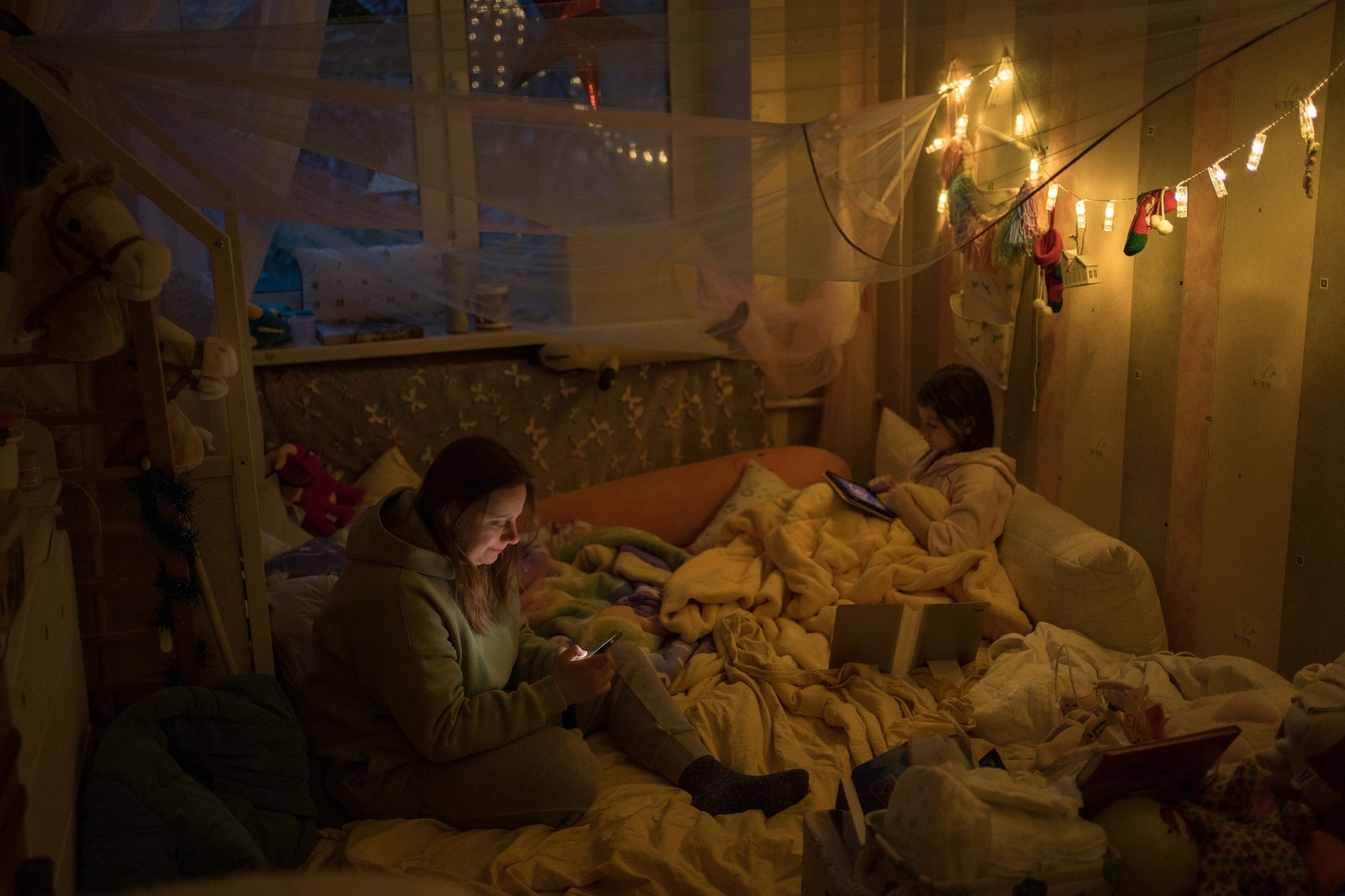 “I hung up a bunch of clothes, kids’ dresses, on the entrance of the room to keep the heat in. The floor is warm because there is a lab downstairs, and their generator runs all the time. We shoved pillows, blankets, and all the soft toys we had into every possible gap. I go out in a winter coat, usually just to the kitchen for food,” she said.