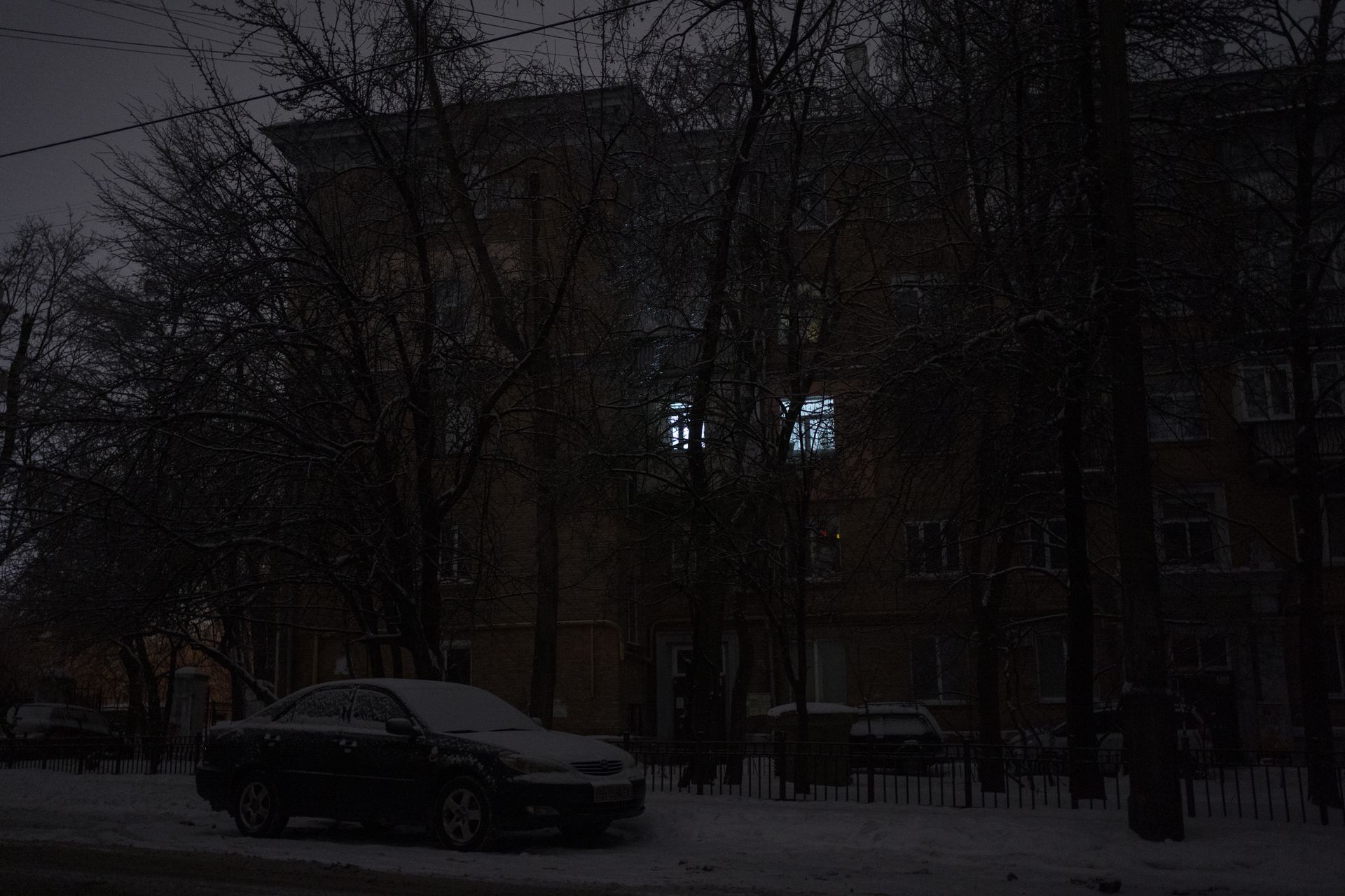 A residential building in Kyiv, Ukraine, is seen without electricity or heating on Jan. 13, 2026. (Elena Kalinichenko / The Kyiv Independent)