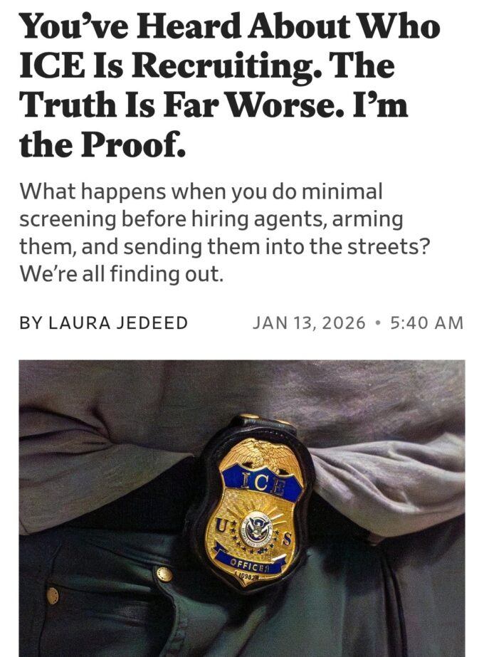 “They began the Civil War with little notice: except it’s the US government with an anonymous ICE army waging warfare on citizens. Focus now is on brown- & Black-skinned persons in Minneapolis & their white defenders/friends (like Rene Good); but will probably soon spread, with new ICE agents swarming into urban areas in Democratic states. In this Civil War, ICE has all the weapons & the “law” on its side; the rest of us, unarmed, unorganized, unprepared, quixotically committed to US laws.”