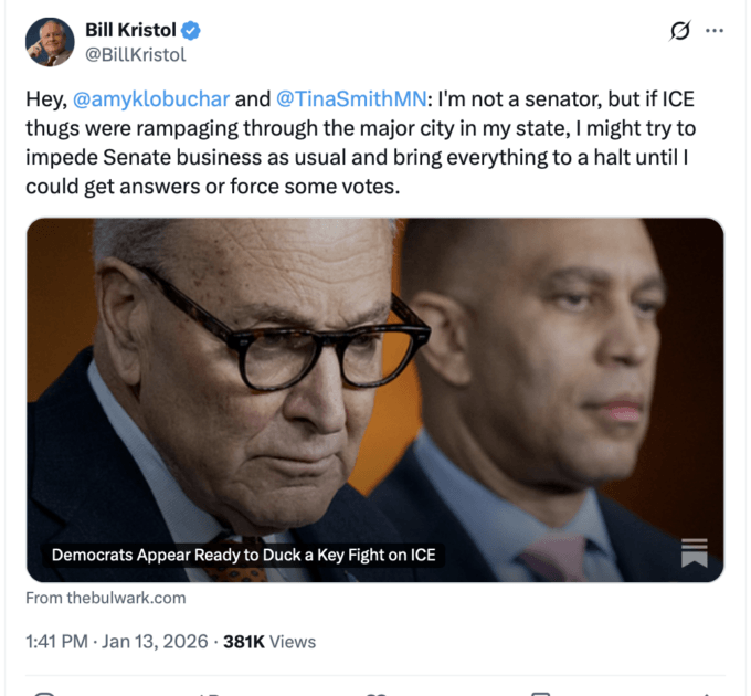 - Border Patrol prima donna Gregory Bovino on the ICE protesters in Minnesota: “We have members of the community, some of the weaker-minded constituents that fall victim to Tim Walz and Jacob Frey’s rhetoric coming against us.” “Weaker-minded”? How about “strong moral constitution,” “exceptional bravery in the face of armed, masked, violence-prone thugs,” “compassionate and empathetic,” “defenders of the Constitution’s core principles.”
