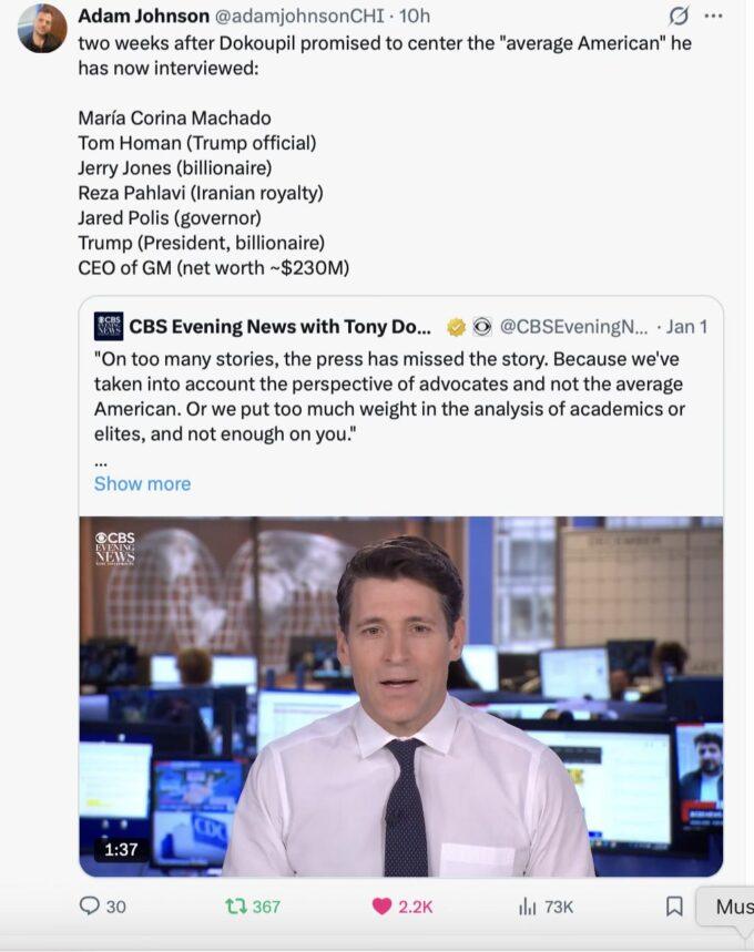 Tony Dokoupil, the weepy new anchor of CBS News, hand-picked by Bari Weiss, got dunked on by Trump, who made clear who his TV daddy was…
