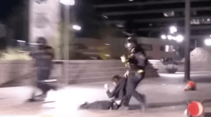 After being shot, Rummler collapses to the pavement, hands to his face. The ICE man who shot him grabs the hood of Rummler’s jacket and drags him across the ground. As the hood tightens around his throat, Rummler heaves for breath. It looks like he’s being strangled. Blood seeps from his left eye, which has been permanently damaged by shards of plastic, metal and glass. Other ICE officers start firing pepper balls at a man’s throat and head as he tries to film the encounter with his cell phone.