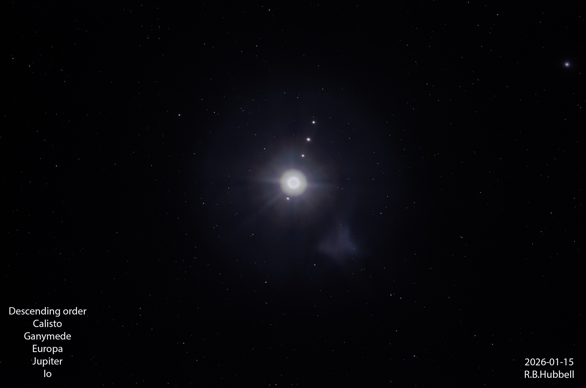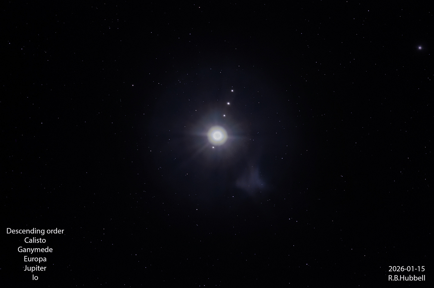 I include an over-exposed image because it clearly shows the “Galilean moons.” When Galileo trained his rudimentary telescope on Jupiter, he saw four moons. After two nights of observing, Galileo realized the moons were orbiting Jupiter, which led him to conclude that our moon orbits the Earth and that the Earth orbits the Sun. For that insight, the Catholic Church placed Galileo under “house arrest” for the rest of his life.