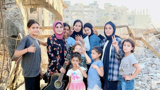 Today, the 32-year-old travels long strenuous routes to teach music to the children of Northern Gaza. During these 45 minute sessions, she introduces students to folk songs which they memorize and recite together. The study of lyrics, rhyme schemes, and guitar chords provides a needed respite from the children’s unending search for food, water, and shelter from Israeli bombardment.