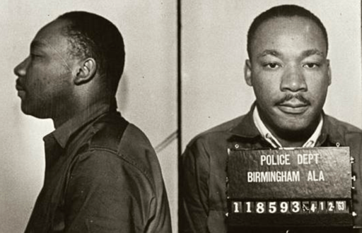 Dr. King, arrested for protesting the treatment of black people in Birmingham, 1963. Image Wikipedia.