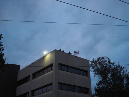 Federal agents on the roof of the ICE facility in Portland, OR. Photograph by Nathaniel St. Clair