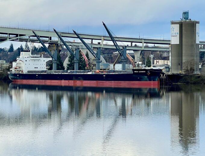Cargo ship off-loading on the Willamette River in Portland, Oregon. Photo: Jeffrey St. Clair.