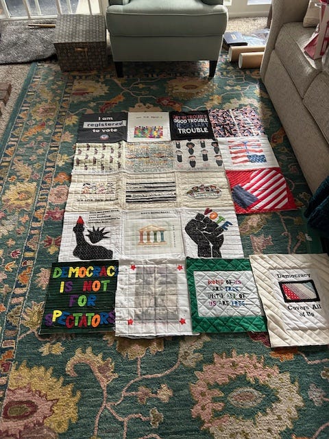 Attached is a photo of the squares we’ve quilted together so far. You’re warmly invited to contribute a square, and you don’t have to be a proficient quilter to do so. To receive simple guidelines for creating and submitting your piece, please email quiltfordemocracy@gmail.com. Together, our individual expressions will become a shared testament to the care, responsibility and hope that sustain a living democracy.