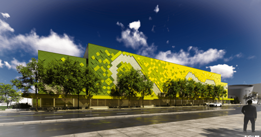 The new Butterdome façade draws on the University of Alberta’s official green and gold colours and will include a lighting feature mimicking the North Saskatchewan River.