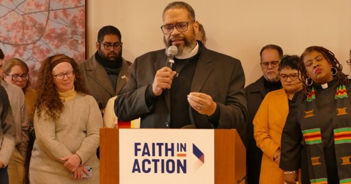 “Hear us oh God for our siblings across this land who are in fear and trembling even at this moment and hour, for the young folk that are not in schools because they are afraid today, for the people that can’t go to their jobs to provide for their families because they are afraid today,” he said, eyes closed. “God, for the folk that are afraid to answer their doors because they’re not sure who is knocking. God, we pray that people of faith and moral courage will go stand in the gap.”