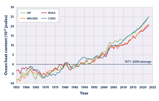 This figure shows changes in heat content of the top 700 meters of the world’s oceans between 1955 and 2023 (US EPA)