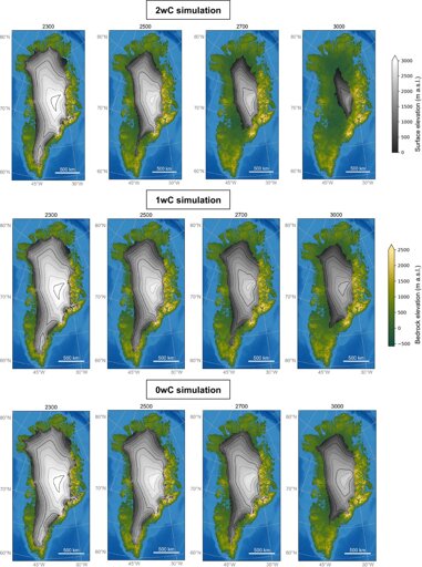 Greenland, which has been prominently in the news in recent days, hosts a vast ice sheet. If it melts, it will become one of the largest contributors to global sea-level rise. Under a high-emissions scenario, the Greenland Ice Sheet is expected to largely disappear over time, with far-reaching consequences. This is the conclusion of a new study by Chloë Paice and colleagues, published in The Cryosphere. The Greenland Ice Sheet contains enough ice to raise global sea levels by approximately 7.4 meters and has been losing mass at an accelerating rate since the 1990s. Roughly half of this loss is due to surface melt, while the other half results from ice calving where the ice sheet meets the ocean.