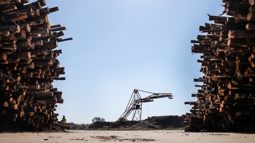 A crane whisks logs into the Drax wood pellet mill in Gloster, Mississippi. Kathleen Flynn / The Guardian