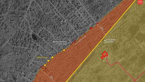 This is the case in Jabaliya, for example, where the berms follow the path of the yellow blocks that Israel has been extending into the area under its control, but beyond the line marked on its own maps. Some of the berms have been constructed across roads, cutting them in half.