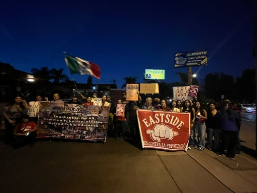 The rally and march, organized by Eastside Padres Contra la Privatización, a community group that defends public education from charter schools, took place during increased ICE activity in East Los Angeles. Protesters held signs and chanted demands calling ICE out of East LA, catching the attention of passing cars and pedestrians.