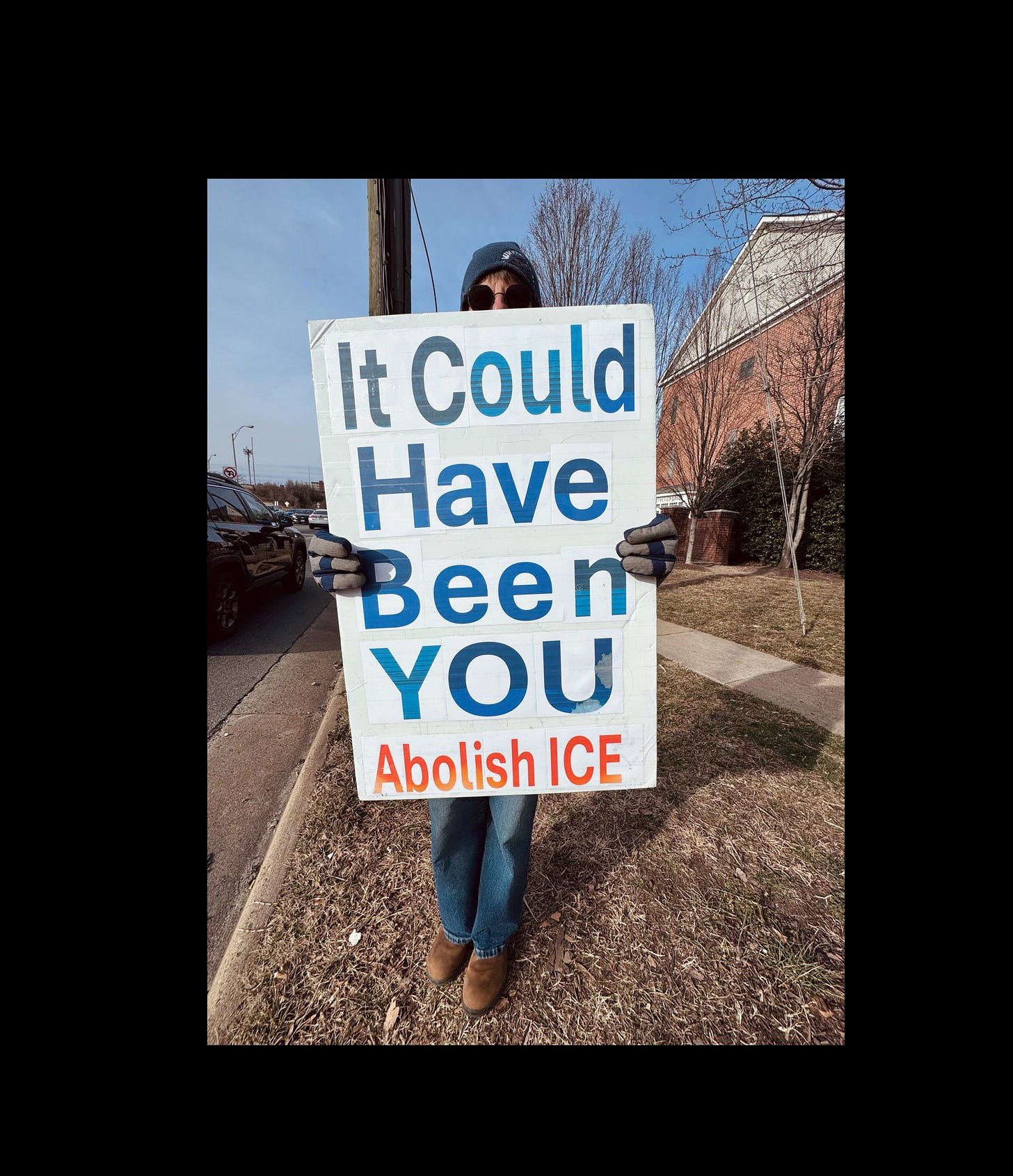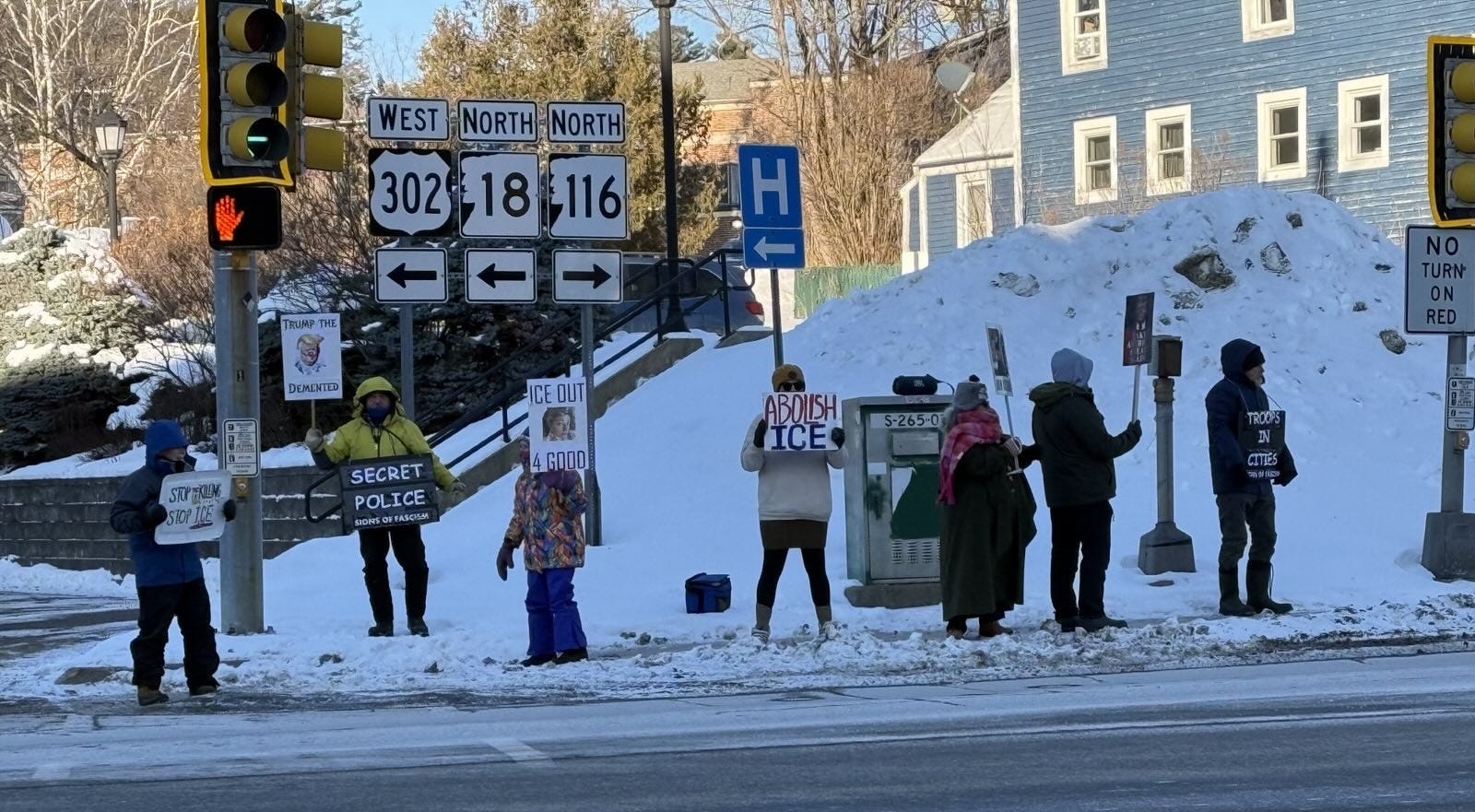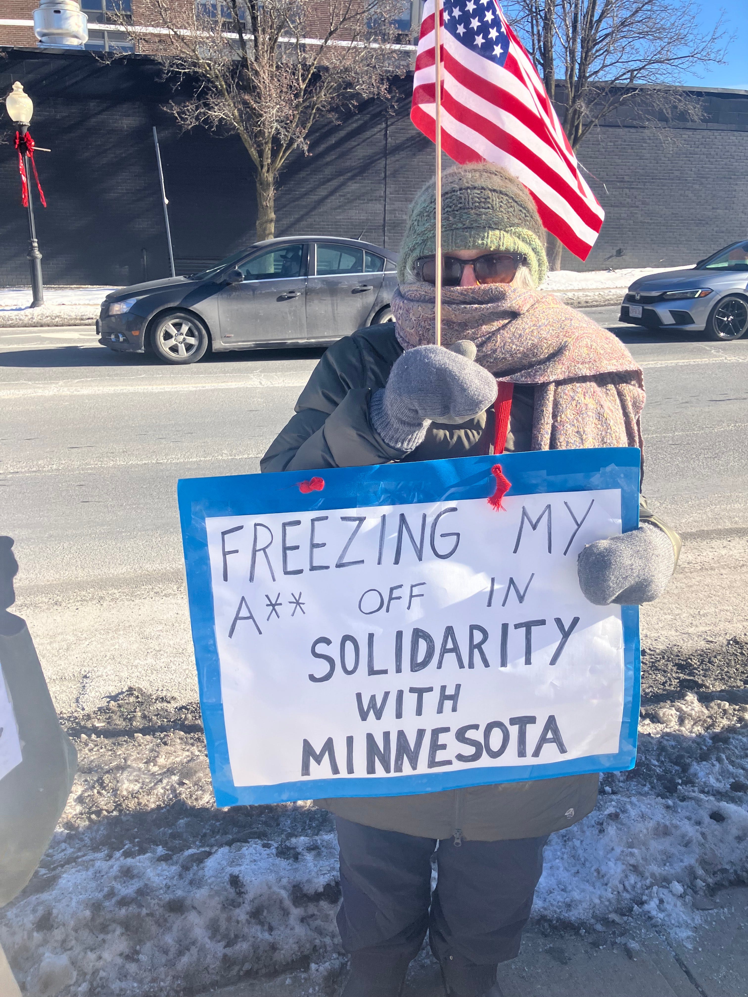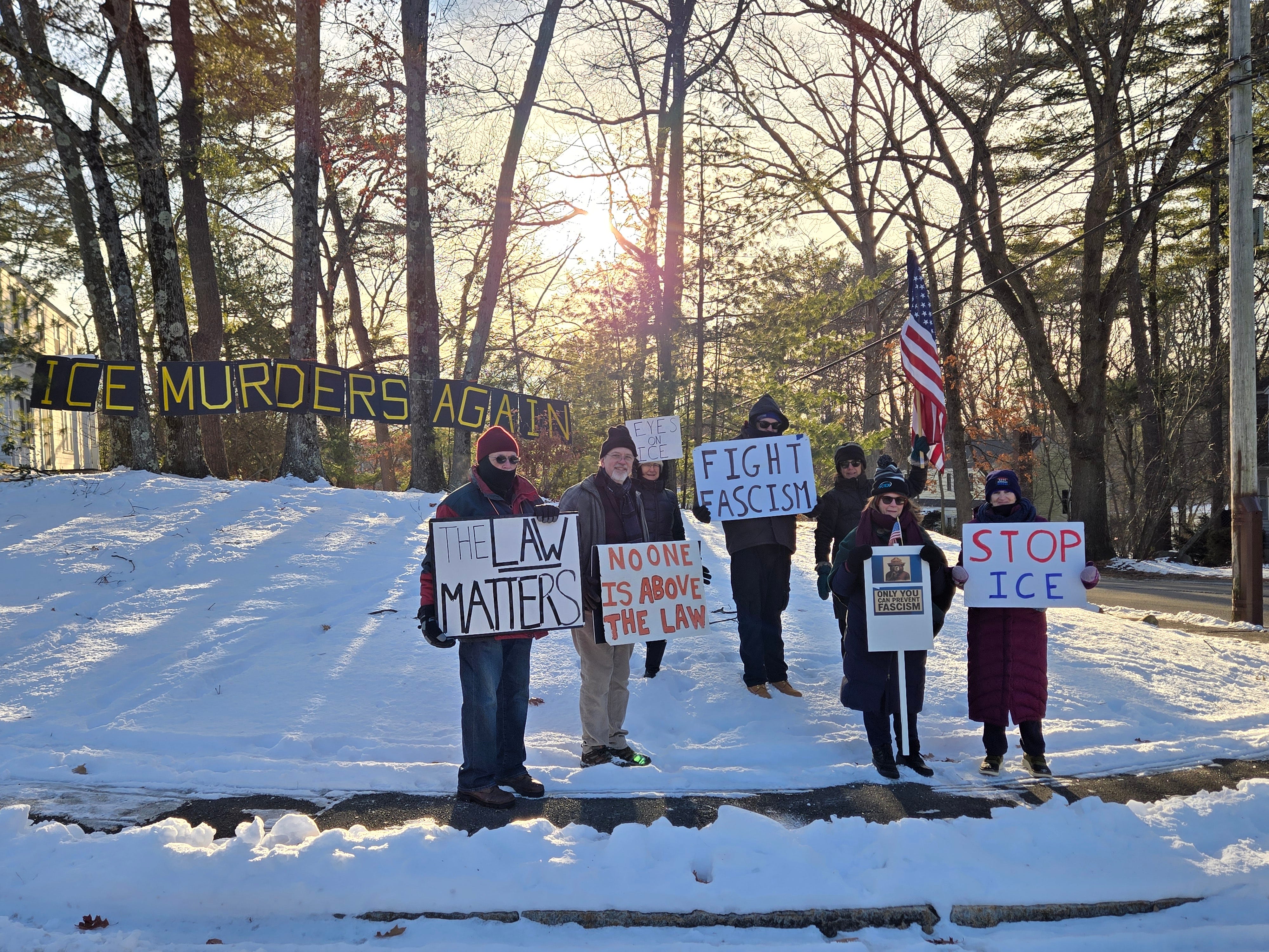 Signs of Democracy, Arlington. 50 people showed up on the coldest day of this winter to share our outrage over the murder of Alex Petti.