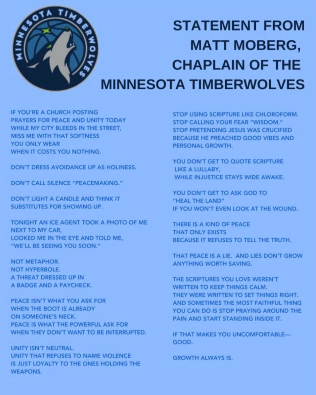 Matt Moberg, the Chaplain of the Minnesota Timbervolves, just posted this: