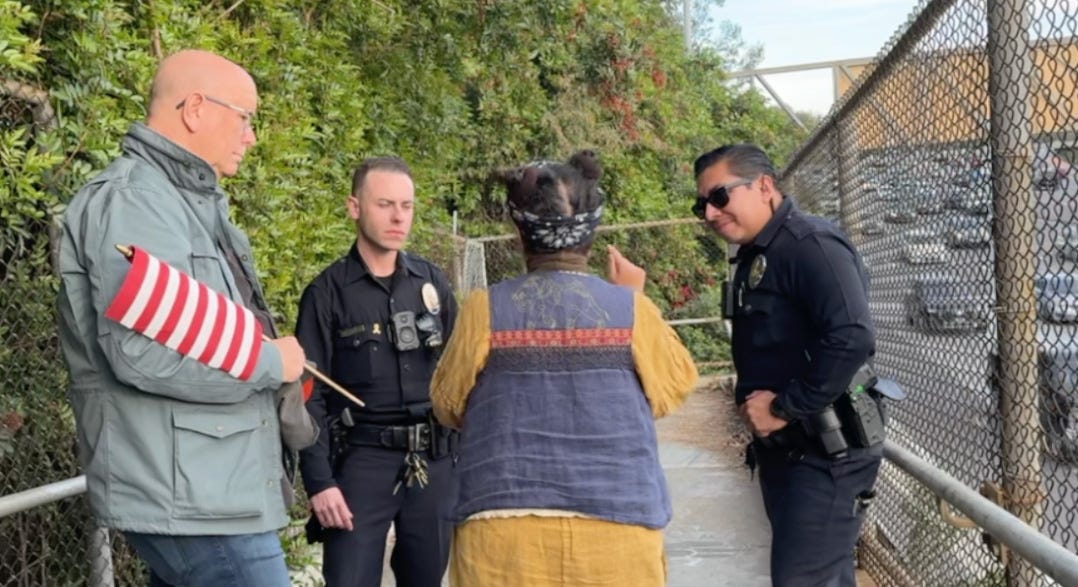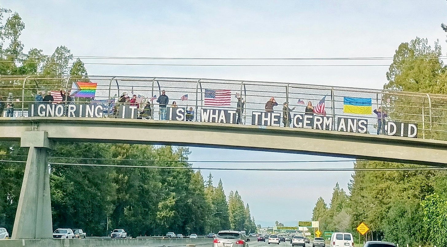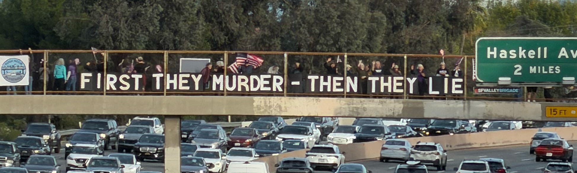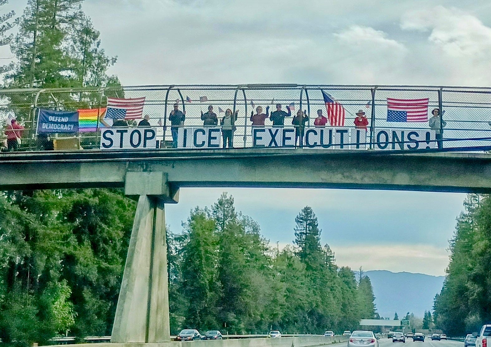 Jill and I joined a “pop-up” bridge brigade on Sunday in our “usual spot” on a pedestrian overpass spanning the 101 Freeway. The level of support—honks, waves, peace signs, and “power to the people” salutes—was the highest it has ever been. Indeed, the response was so overwhelming that neighbors adjacent to the freeway complained about the noise from the honking, which led to a brief but mutually respectful discussion with the LAPD (see photo below, or Jill’s blog, here: Everyday with Jill, Protesting Alex Pretti’s Murder.)