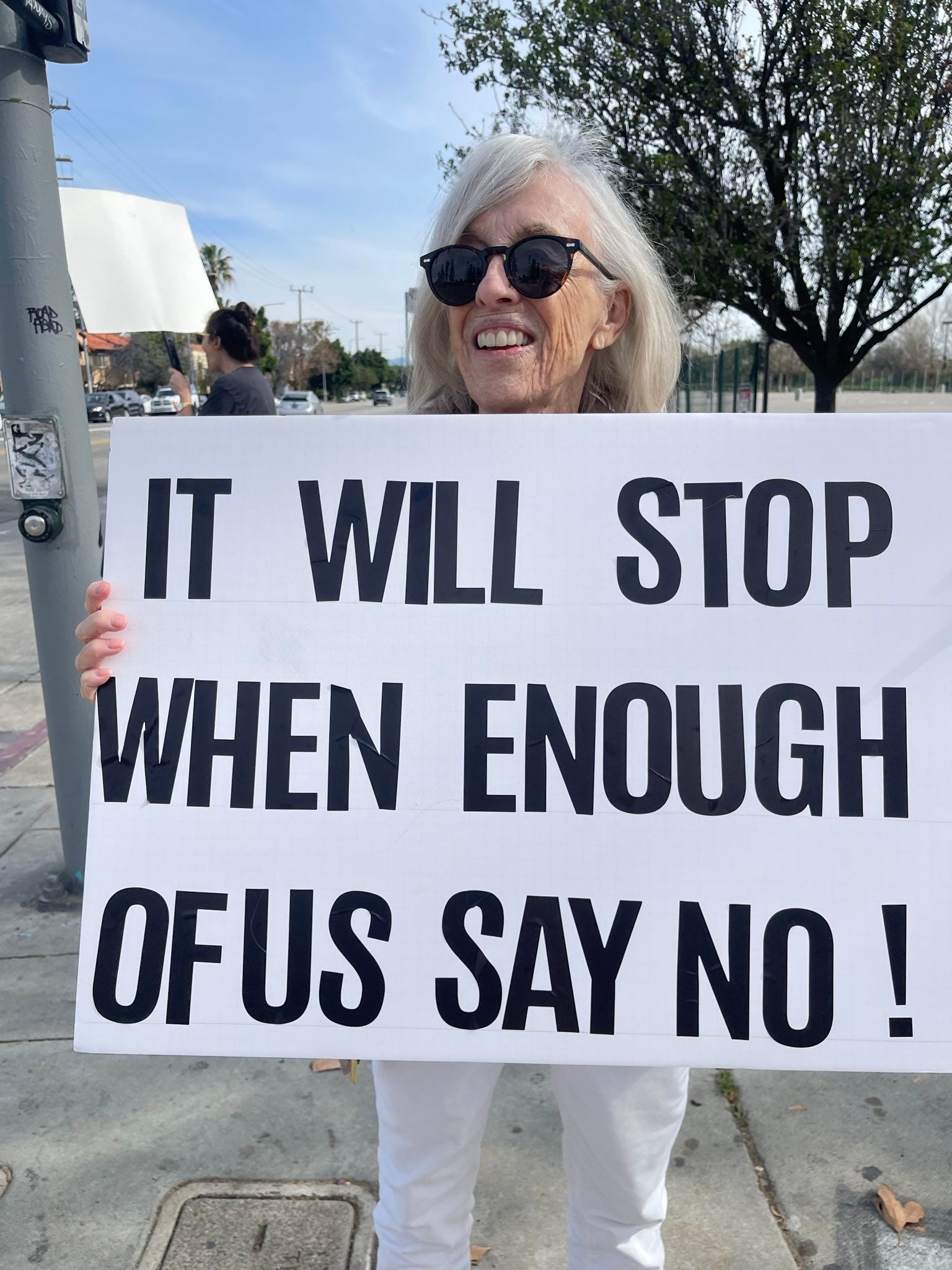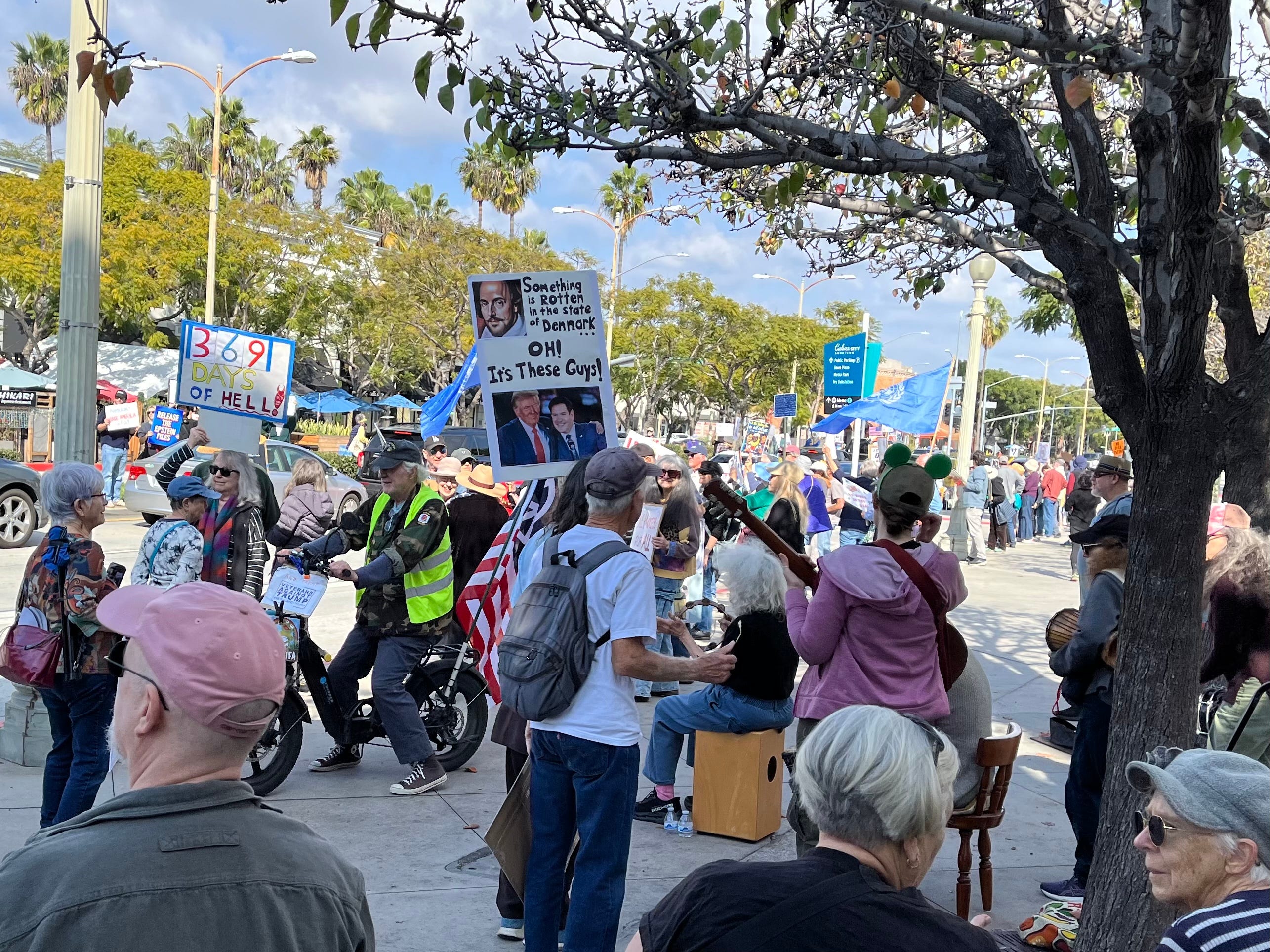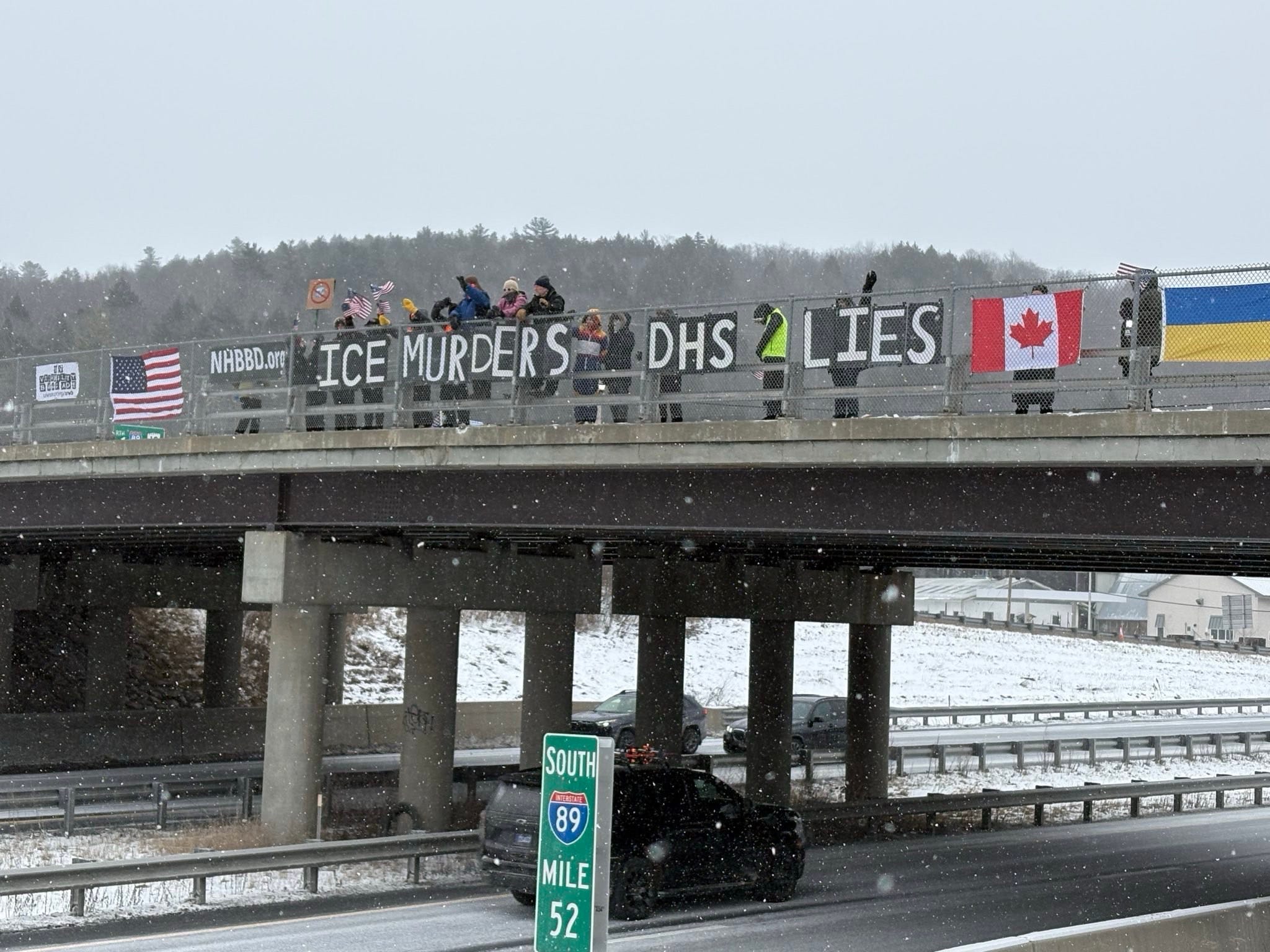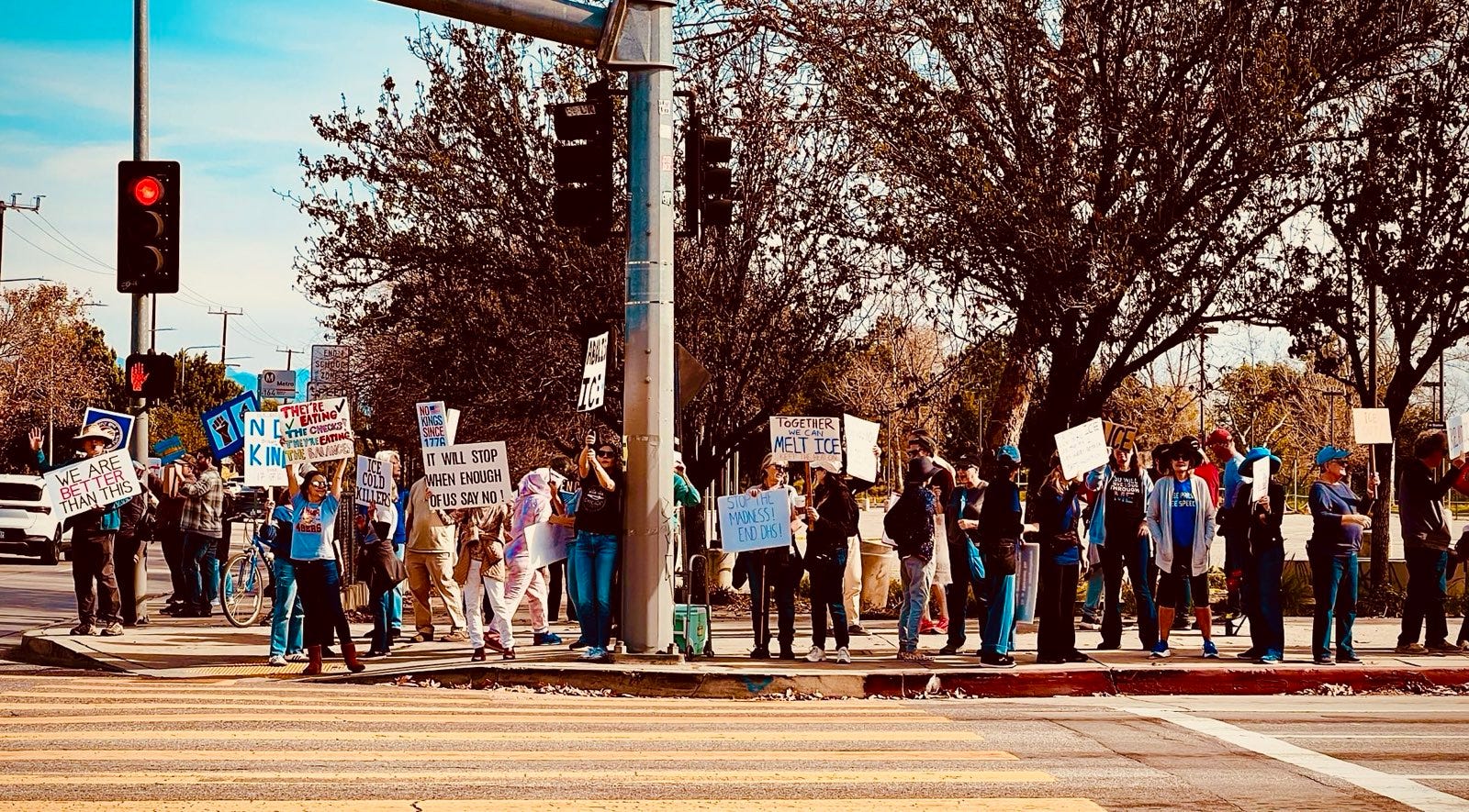 Jill and I joined a “pop-up” bridge brigade on Sunday in our “usual spot” on a pedestrian overpass spanning the 101 Freeway. The level of support—honks, waves, peace signs, and “power to the people” salutes—was the highest it has ever been. Indeed, the response was so overwhelming that neighbors adjacent to the freeway complained about the noise from the honking, which led to a brief but mutually respectful discussion with the LAPD (see photo below, or Jill’s blog, here: Everyday with Jill, Protesting Alex Pretti’s Murder.)