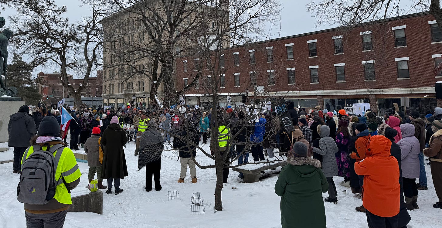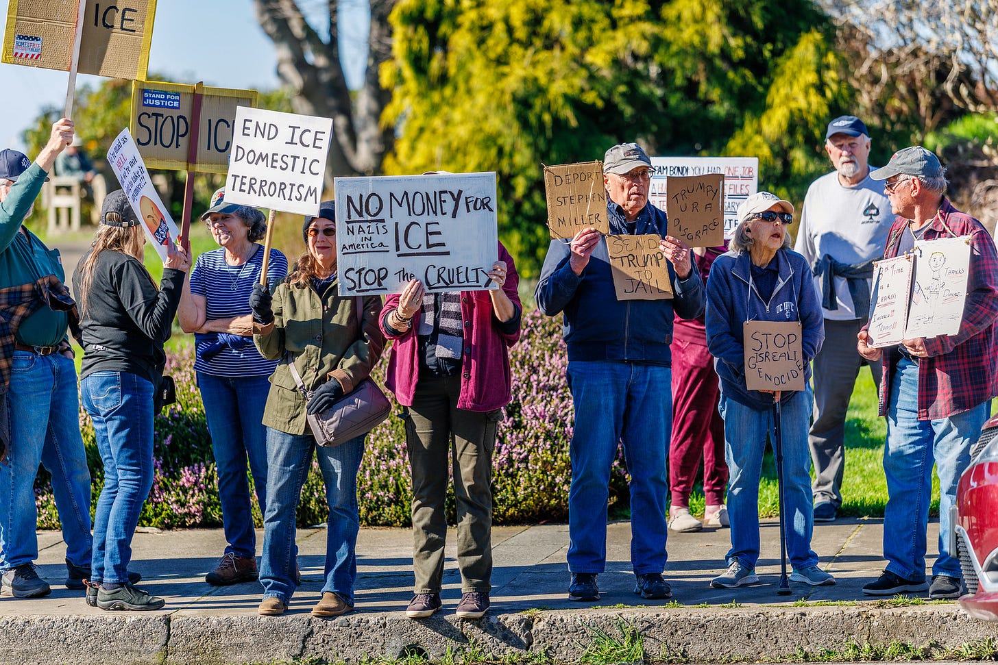 Because the killing of Alex Pretti occurred on early Saturday morning during a widespread winter storm, it was more challenging than usual to organize large protests—although there were some notable exceptions. It is my fervent hope that the coming week will bring larger protests and an organized call for a national strike that is led by grassroots organizations like Indivisible.