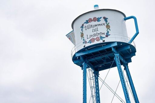 An old water tower converted into a functioning large Swedish coffee pot showcases Lindström, Minnesota's Swedish roots