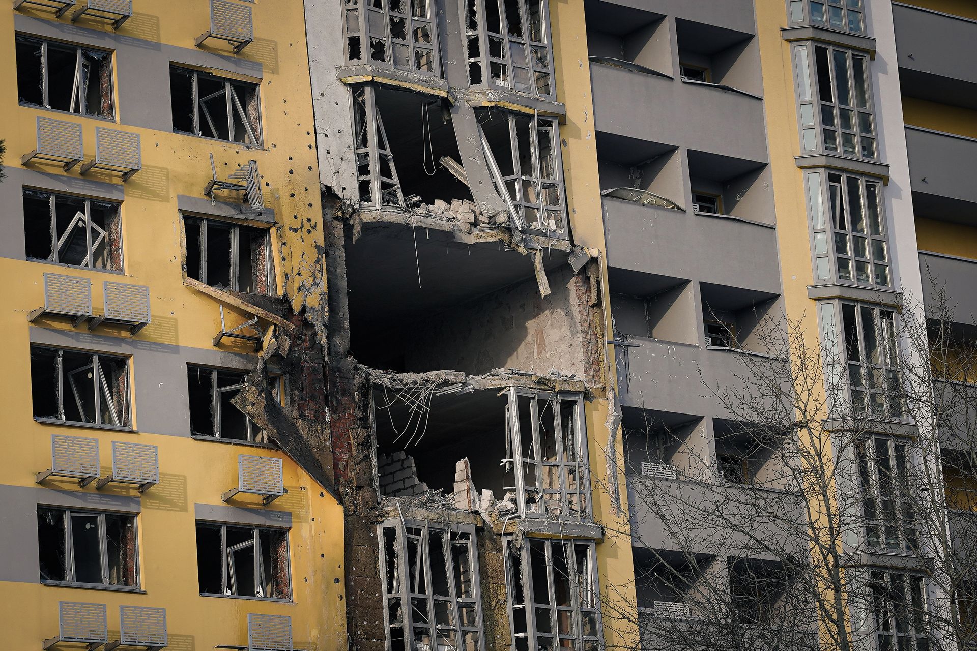Facade and apartments of an unfinished residential high-rise building are damaged by a Russian drone strike on Jan. 24, 2026, in Kyiv, Ukraine. (Khodkov Andrii/Global Images Ukraine via Getty Images)