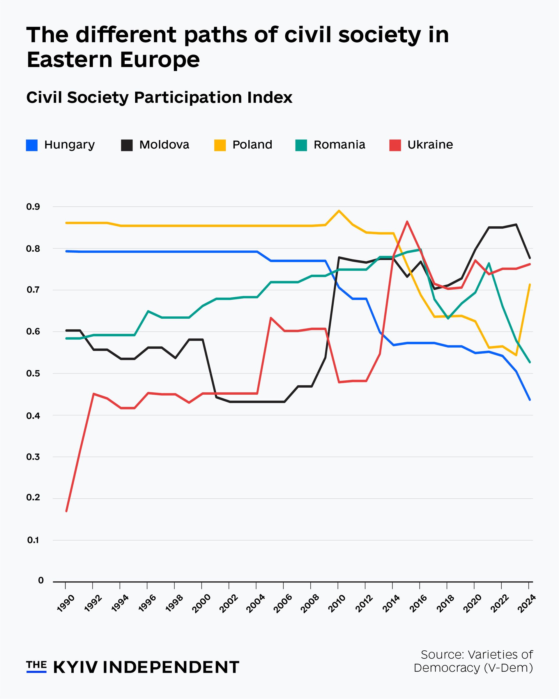 For Hungary, the decline is simply Orban marginalizing civil society. The Orban regime does not consult civil society organizations, and there is lower political competition in Hungary. And in Poland, the Law and Justice party, which had followed Orban’s playbook, lost the election in 2023, and we already see some recovery since.