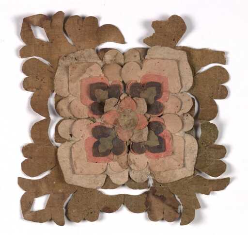 Loosely based on a square format, similar to other architectural rosettes of the period, the paper flowers were likely attached to a wall or some other substrate, as they still have a dab of glue on their reverse sides. And their characteristics vary greatly, from a relatively simple painted composition to layered floral designs made with a range of paper thicknesses.