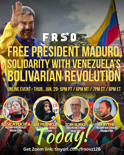 On Thursday, January 29, 8pm Eastern, 7pm Central, 6pm Mountain, and 5pm Pacific, the Freedom Road Socialist Organization will host a forum: “Free President Maduro! Solidarity with Venezuela’s Bolivarian Revolution!”