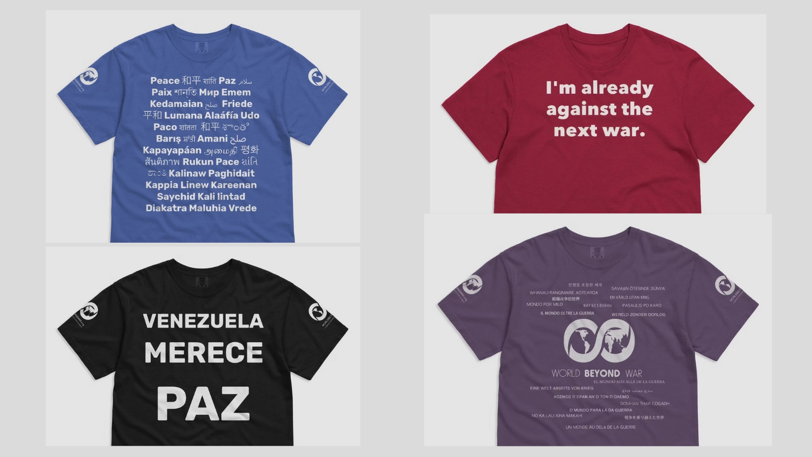 Our new shirts include one with the word “Peace” in many languages, and another with the words “World Beyond War” in many languages.