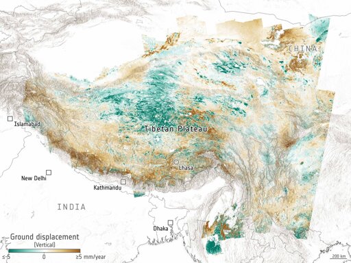 A study on tectonic plates that converge on the Tibetan Plateau has shown that Earth's fault lines are far weaker and the continents are less rigid than scientists previously thought. This finding is based on ground-monitoring satellite data. The study, published in Science, includes several high-resolution maps based on data from Copernicus Sentinel-1 satellites. It shows how the region is being stretched and squeezed by Earth's geological movements.
