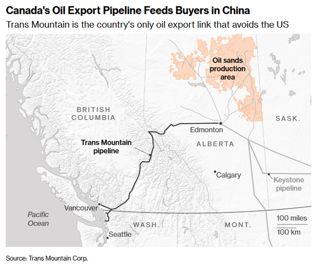 Here is where things get weirder still, that it’s Canadian crude suppliers who are likely to benefit. The Trans Mountain Pipeline runs from oil sands in Alberta to Vancouver. Two thirds of the oil pumped through that line goes to China, with the rest going to the United States.