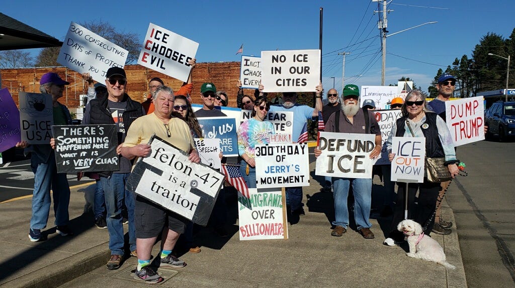 On Thursday, Jerry Conlogue celebrated his 300th day standing up for democracy. From 12 - 1 every day, he and others can be found on N. Hwy. 101 in Lincoln City.
