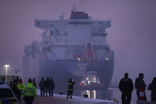 An LNG cargo ship moored in a German port in the Baltic Sea on April 18, 2024. (Stefan Sauer/picture alliance via Getty Images)