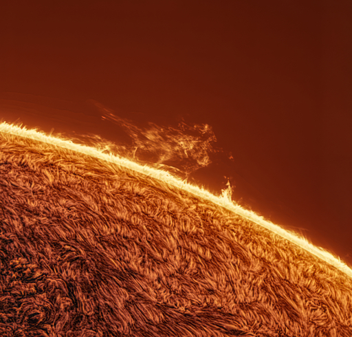 Mark Johnston from Scottsdale, Arizona Prominences are masses of hot plasma that leap off the limb of the Sun, drawn upward along tangled magnetic field lines. The imager used a 6-inch scope and Hα etalon to capture this Feb. 1 example, which appears to resemble a T-rex stomping across our star’s surface.