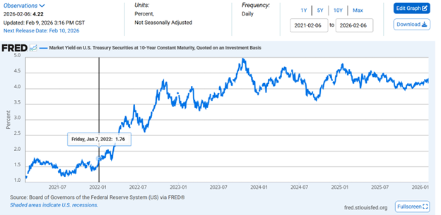 Over the past five years the bond yields on US Treasury debt have risen, sharply. At the beginning of 2022, the US government borrowed money for 10 years at 1.76% per year. Today it’s over 4%, 4.22% as of this morning. Yields have risen, and so when Treasury bonds are priced in dollars, the values are falling:
