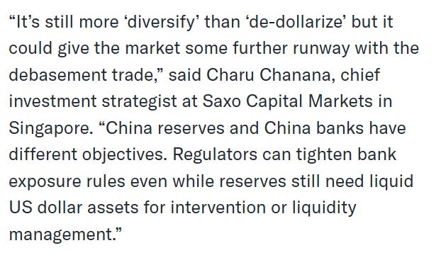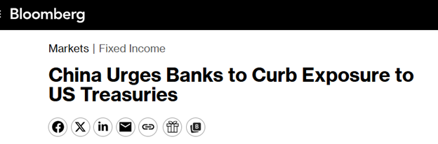 These instructions to Chinese banks are not yet in writing; they’re not yet codified into hard regulation. That gives the banks some time and flexibility to handle the unwinding of their US Treasury holdings. But at any time in the future, bank regulators can officially change what they recognize as bank reserves, which are the basis for new loans. Point here is that China’s regulators today are telling their banks to strongly consider selling Treasuring bonds, and definitely not to buy any more. Tomorrow they may say that for the banks who still hold US Treasuries, they cannot include the full market value of them as part of their capital reserves, used to create new loans for new customers. They’re too risky.