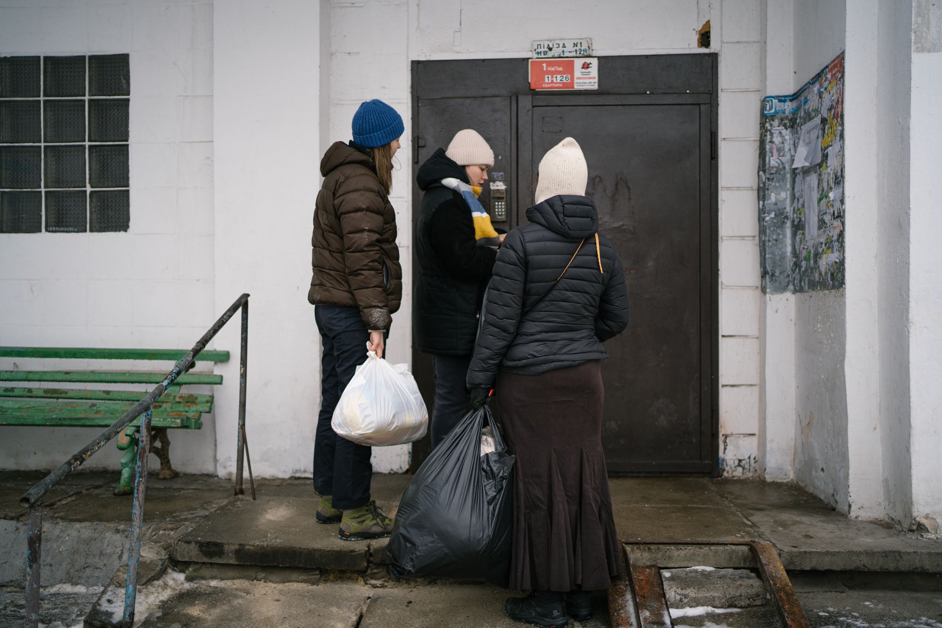 (L-R) The Kyiv Independent journalist Anastasiia Verzun, social worker Yulia Naumenko, and volunteer Lisa enter a building on the east bank of Kyiv, Ukraine, on Jan. 27, 2026. (Khrystyna Kulakovska / The Kyiv Independent)