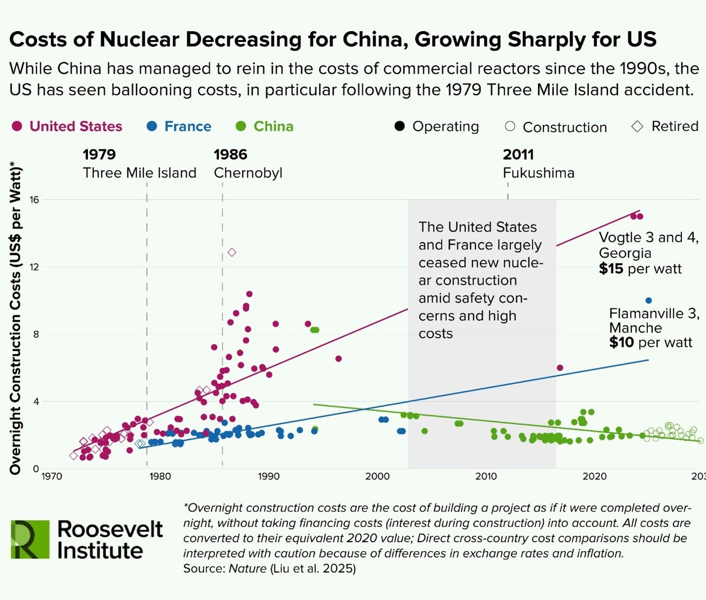 Each dot on this chart represents a nuclear project coming online, and its cost of construction. The most recent nuclear plants in the United States were in Georgia, Vogtle-3 and -4, and that project saw lots of cost overruns and delays. Total build costs in the US are up sharply since the 1960’s, increasing 10 times. Flamanville-3 in France come online a few months later.