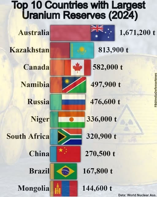 And they also build on the advantages that Global Majority Countries have in raw materials. These reactors need uranium, and this table shows the top 10 countries for uranium reserves: