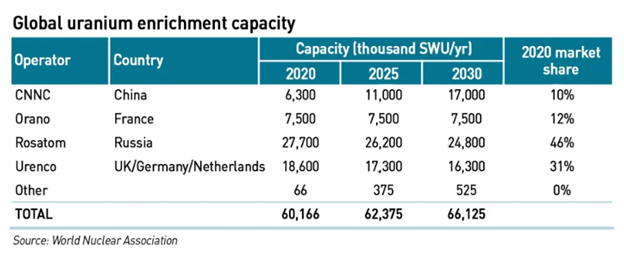 Then we consider the uranium that is actually mined—pulled out of the ground–and it’s Kazakhstan on top, with four times more than Australia. But then comes uranium refining—turning the uranium into enriched fuel that can be used in reactors, and Russia plus China is two thirds of the global total: