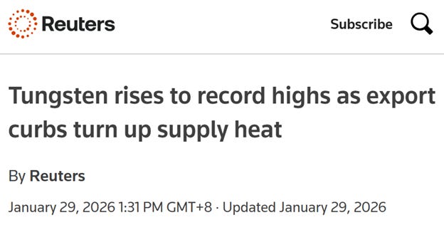 In 2026, it’s more of the same: prices in Europe and in China are at all-time highs, and will go higher. The primary uses are in cutting tools used for manufacturing and heavy industry, aerospace and defense, energy, and electronics. China’s exports of tungsten are down 40%. The rest of the world cannot make up for that loss of supply from China, who produces 67,000 tons a year, compared to just a few thousand tons from everywhere else.