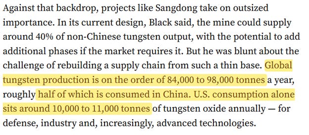 And even with these big price moves, the problem isn’t that tungsten is more expensive. These industries are price-insensitive. The Pentagon, oil drillers, car factories—the price doesn’t matter; they’re paying. But NOT getting the tungsten is the issue now—it means things don’t get built at all, because there are no suppliers who can step up to replace China.