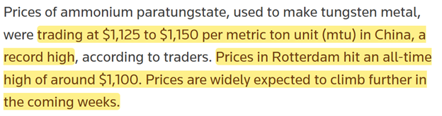 That won’t last — the Rotterdam price will go up faster than in China — but it shows what we’re seeing in other metals markets, in that tungsten suppliers — in this case — cannot respond to these higher prices by increasing output, the way that crude oil producers do, for example.