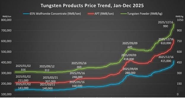 This is what has happened in global tungsten markets since—across the board, prices for the tungsten concentrates and compounds tripled in 2025.