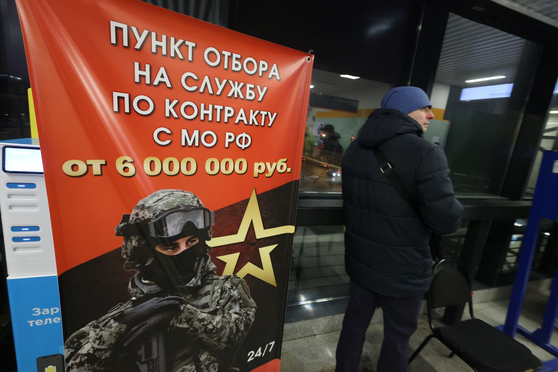 A passerby stands next to a poster advertising contract military service in the Russian armed forces, installed at a suburban railway station, on Jan. 23, 2026, in Dolgoprundy, Russia. The sign reads: “Recruitment point for contract service with the Russian Ministry of Defense. Starting from 6,000,000 rubles”. (Contributor/Getty Images)