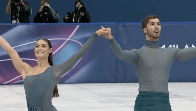 France’s Laurence Fournier Beaudry and Guillaume Cizeron after their controversial gold medal performance in Milan. (Screengrab from video posted to X.)